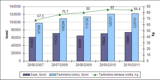 Veidi langesid aga nii köögiviljade kui ka puuviljade ja marjade keskmine tarbimine inimese kohta. Keskmiselt tarbis üks inimene 2010/2011 saagiperioodil 39,9 kg puuvilju ja marju, mis on 5,3 kg vähem kui eelmisel saagiperioodil. Köögivilju tarbisid inimesed oluliselt enam – ühe inimese kohta 84,4 kg, mis on aga 600 grammi võrra vähem kui eelmisel saagiperioodil. See võis olla mõjutatud 2011. aasta alguse kõrgetest köögiviljahindadest.