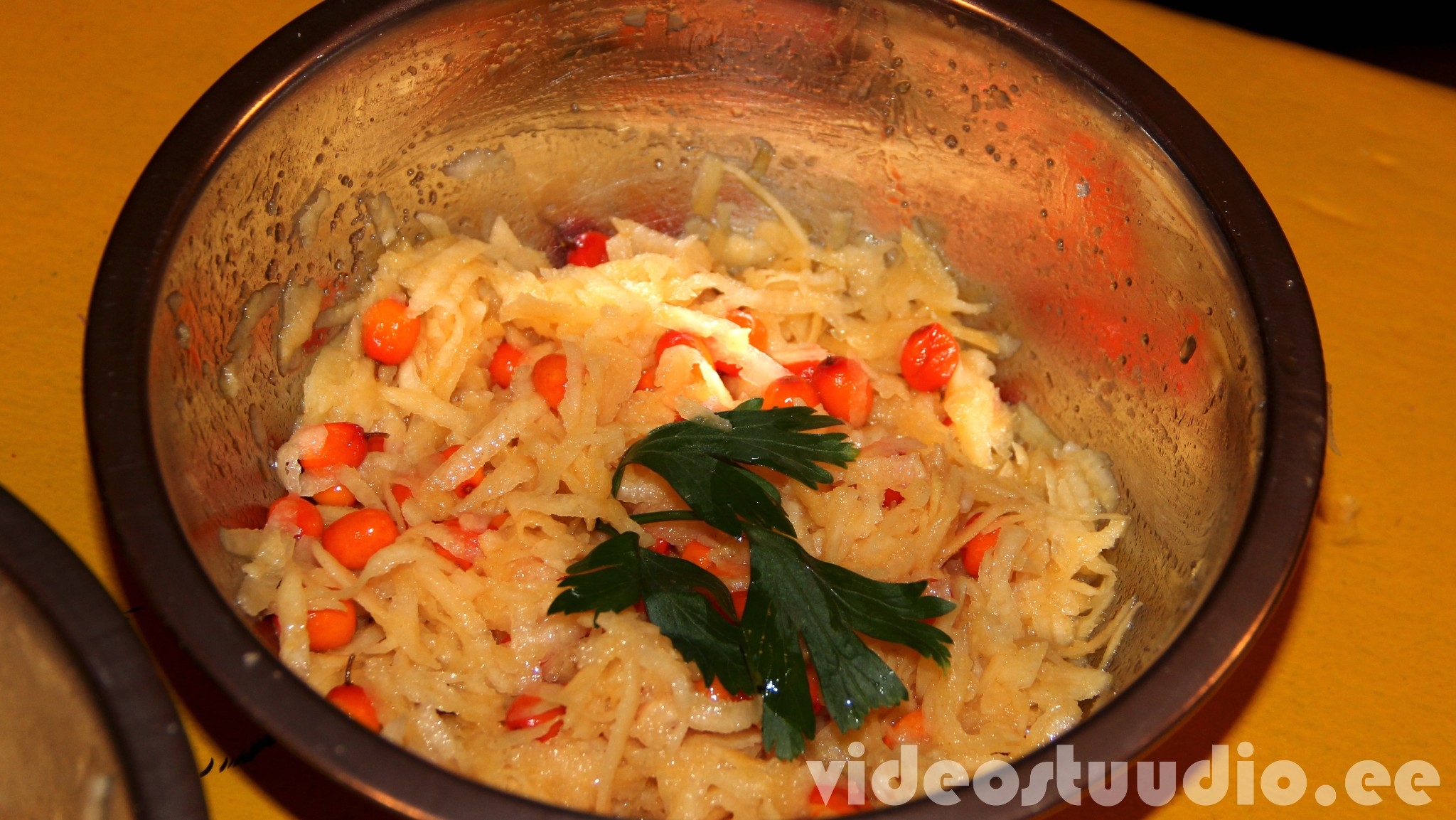 Koori köögivili ja õun, riivi jämeda riiviga, lisa astelpajumarjad.