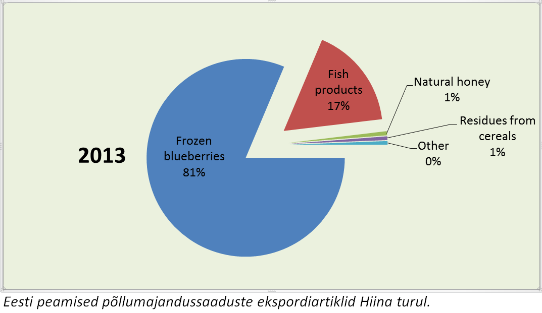 Eesti peamine ekspordiartikkel Hiina turule on olnud külmutatud mustikad, mis moodustavad üle 80% põllumajandussaaduste ekspordist Hiina. Olulisel kohal on ka erinevad kalatooted ja krevetid. Naturaalse mee eksport Hiinasse mullu võrreldes 2012. aastaga küll kahekordistus, kuid kogus oli siiski tagasihoidlikud 13 tonni.
