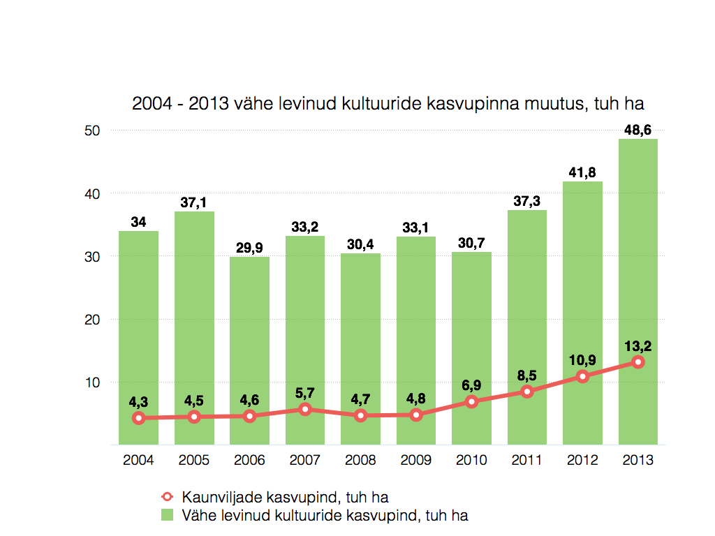 Hoolimata tugevast kasvupinna langusest mõningate kultuuride osas, iseloomustab kokkuvõttes viimast 10 aastat vähe levinud kultuuride kasvupinna osas siiski positiivne kasvu trend. Vähe levinud kultuuride kasvupind kokku oli 2013. aastal 48 600 hektarit, mis on 14 600 hektari võrra suurem kui 2004. aastal, kui vähe levinud kultuuride kasvupind oli kokku 34 000 hektarit.