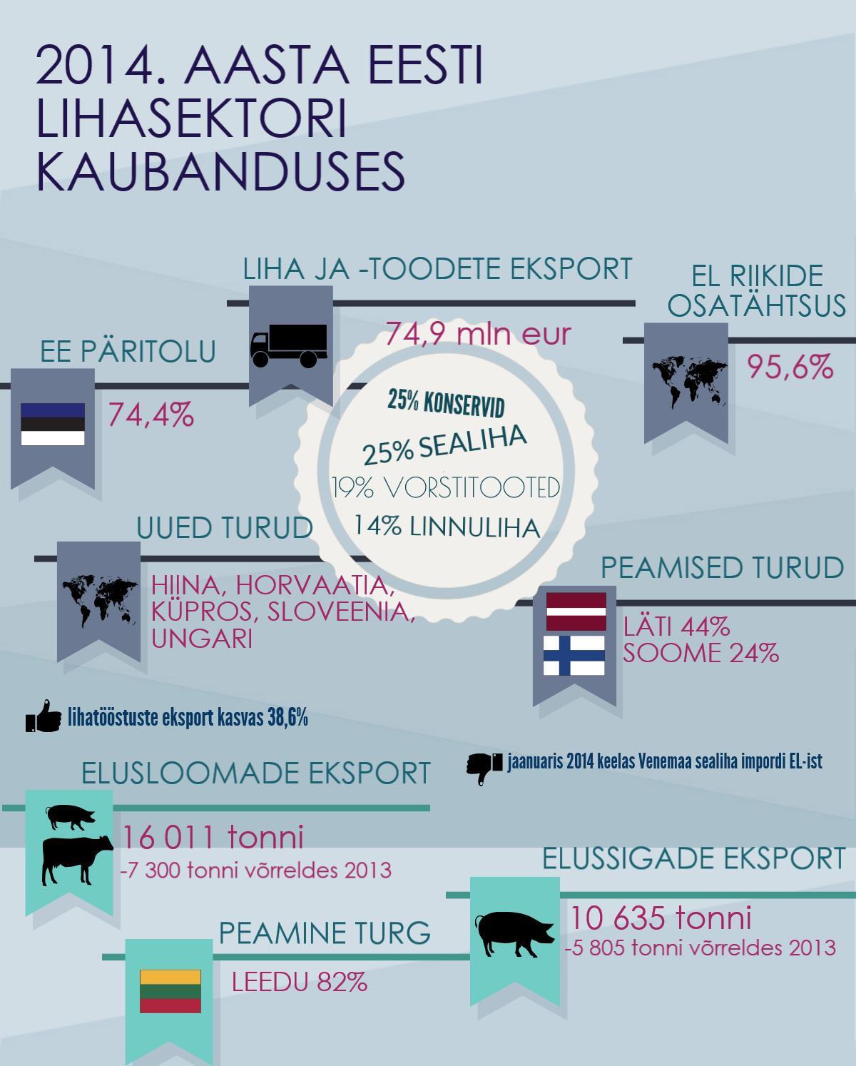 Eesti päritolu liha ja lihatoodete ekspordi osakaal oli 2014. aastal 74,4%. Eestimaise päritoluga toodangu osakaal ekspordis on võrreldes 2013. aastaga 5,8% kasvanud. Kõige suurem oli kodumaine päritolu vorstide ekspordis, väikseim aga lambaliha puhul.