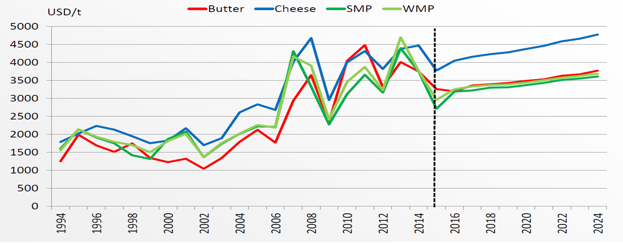 Vaatamata 2014. aastal aset leidnud piimatoodete hinnalangusele prognoositakse eelseisvaks kümnendiks suhteliselt stabiilseid hinnatasemeid. Eeldatav hinnatõus leiab aset nominaalhindades, reaalhinnad jäävad pigem muutumatuks või vähenevad veidi. Piimatoodete hinnatasemed ületavad edaspidi kindlalt 2007. aasta eelseid hinnatasemeid.