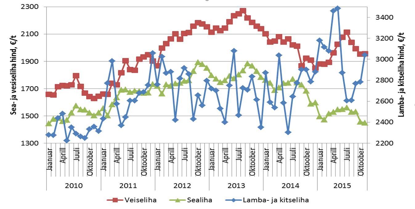 2015. aastal lamba- ja kitseliha kokkuostuhind kasvas, samas kui sealiha hind langes oluliselt. Veiseliha keskmine kokkuostuhind jäi aasta keskmisena sarnaseks 2014. aastale.
