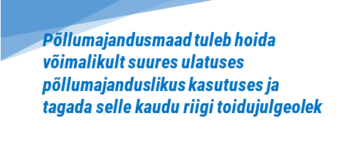 Maakatastri andmetel oli 2019. aasta lõpuks registreeritud 1,05 miljonit hektarit haritavat maad, 240 000 hektarit looduslikku rohumaad ja lisaks 2,29 miljonit hektarit metsamaad. Viimase viie aastaga on haritava maa ning metsamaa pindala suurenenud, samal ajal aga on loodusliku rohumaa pindala vähenenud. Põllumajandusmaa ja põllumullad taastumatu loodusressurss, mida tuleb kasutada säästlikult ja mille säilimine tuleb tagada. Esialgsete arvestuste kohaselt on Eestis väärtuslikku põllumajandusmaad umbes 700 000 hektarit. Põllumajandusmaad tuleb hoida võimalikult suures ulatuses põllumajanduslikus kasutuses ja tagada selle kaudu riigi toidujulgeolek ja võimalus nendel maa-aladel põllumeestel toimetada. Põllumajanduskeskkonna hea seisundi säilitamisel ja parendamisesse panustab põllumeeste kasvanud keskkonnateadlikkus ja vabatahtlikud täiendavad tegevused. Samuti on kasvanud ka ühiskonna üldine teadlikkus ja ootus keskkonnaküsimustes. Hea keskkonnaseisund panustab samuti Eesti kui kvaliteetse toidu tootja mainesse, mis võimaldab eksportida kaugematele turgudele.