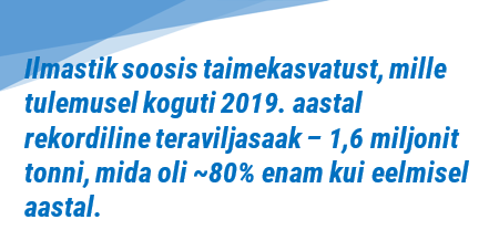 Head ilmaolud soosisid taimekasvatust, mille tulemusel koguti 2019. aastal rekordiline teraviljasaak 1 624 574 tonni. Teravilja kasvupind oli 2019. aastal 364 364 hektarit. Võrreldes eelmise aastaga suurenes taliteraviljakasvupind 73%. Kasvu võimaldas eelnenud aasta põuane suvi, kui teravilja pidi varakult ära koristama ja sai alustada talivilja külviga. Samas suviteravilja kasvupind vähenes 2019. aastal 22%. Teravilja kogusaagist moodustas nisu 52%, oder 32%, rukis 7% ja kaer 6%. Võrreldes eelneva aastaga suurenes nisusaak 88%, odrasaak 51%, kaerasaak 24% ning rukkisaak neli korda. Teravilja keskmiseks saagikusekskujunes 4,5 t/ha, mis suurenes aastases võrdluses 70%.
