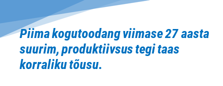 Piima kogutoodang oli viimase 27 aasta suurim, produktiivsus tegi taas korraliku hüppe. Statistikaameti esialgsetel andmetel oli 31. detsembril 2019 Eestis 254 000 veist, aastakeskmine piimalehmade arv oli 85 000, mis võrreldes eelmise aastaga veidi vähenes. Piima kogutoodang suurenes 821 500 tonnini ehk 3%. Aastane piimakus kasvas keskmiselt 3,7% lehma kohta ja jõudis 9633 kilogrammi tasemele. Piimakarjade arv jätkas vähenemist – kuigi eelmiste aastaga võrreldes veidi aeglasemas tempos. Piima aasta keskmine kokkuostuhind oli 310 €/t, jäädes üpris eelmise aasta tasemele (+0,8%).
