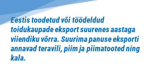 Koduturu tarbimise piiratusest ja meie tööstuste piisavast võimekusest tulenevalt on väga olulisel kohal eksport. Eesti eelisteks EL-i ja muu maailma konkurentsis on pikaajalised traditsioonid toiduainete tootmisel ning loodusliku ja ökoloogiliselt puhta toorme kasutamine. Eestis toodetud või töödeldud põllumajandussaaduste ja toidukaupade eksport oli 2019. aastal hinnanguliselt 1,1 miljardit eurot, mida oli viiendiku võrra rohkem, ja ühtlasi oli see ka viimase viie aasta rekord. Teravili moodustas ekspordikäibest 20% (maht suurenes aastaga ligi 100%) ning piim ja piimatooted 19%. Tuleb siiski tõdeda, et ligi kolmandik meie põllumajandussaadustest eksporditakse väärindamata kujul, kuid eksporditulu suurendamiseks peaks välja viima rohkem just töödeldud tooteid. Eesti põllumajandussaaduste ja toidukaupade eksport on tugevalt orienteeritud Euroopa Liidu siseturule – umbes 80% ekspordikäibest tuleb kaupade müügist teistesse EL-i liikmesriikidesse. Olulisemad sihtriigid on aga lähinaabrid – Soome, Läti ja Leedu. Kuigi koguekspordist moodustab suure osa tooraine väljavedu, teevad tööstused pidevalt tööd toodangule uute turgude leidmise nimel. Toidutööstused ekspordivad umbes kolmandiku (~560 mln €) oma toodangust. Kõige suurem osakaal toiduainetööstuste ekspordis on piimatööstusel (~20%), kala, liha ja joogitööstuse osakaal on kõigil ~10%, teiste tegevusalade osakaal on väiksem.
