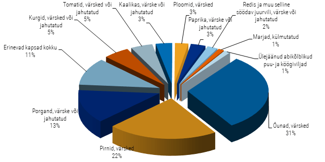 Koolipuuvilja ja -köögivilja tarbimise osakaal erinevate toodete kaupa perioodil 1.08.2018–31.07.2019 on kujutatud joonisel 1.