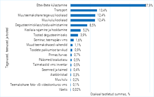 Kaasnevate haridusmeetmete rakendamiseks maksti 2018/2019. õa taotlusvoorus esitatud 57 taotluse alusel toetust kokku 165 300 €. Kaasnevate haridusmeetmete raames läbiviidud tegevuste, ostetud teenuste ja toodete loetelu koos nende osakaaluga taotletud summas on esitatud joonisel 3.
