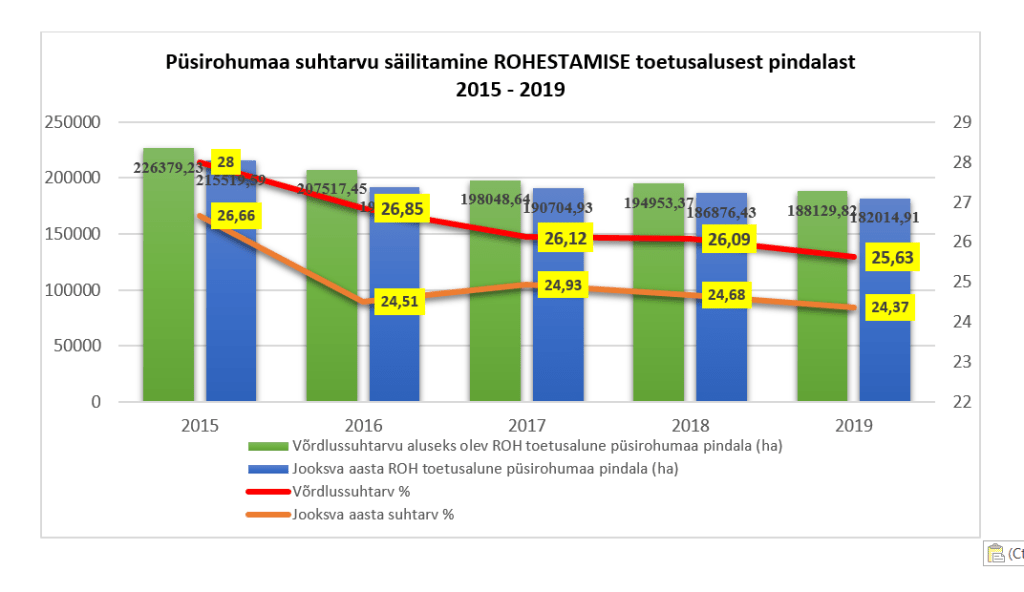 Esimene suurem püsirohumaa pinna langus 7700 hektari näol ilmnes alles 2014. aastal, vahetult enne käesolevale finantsperioodile üleminekut, mis algas 2015. aastal, kui lisandusid uued toetused nagu kliimat ja keskkonda säästvate põllumajandustavade toetus ehk rohestamine, mille eest makstakse toetust tingimusel, et taotlema peab samal ajal ka ühtset pindalatoetust.