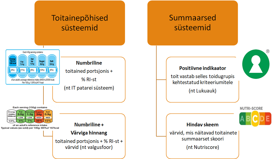 Toitainepõhised süsteemid annavad infot kindlate toitainete kohta kas üksnes arvväärtuste abil, nagu Itaalia süsteemis, või lisaks ka värvide abil, mille näiteks on valgusfoorisüsteem. Summaarset hinnangut andvate süsteemide hulgas on positiivsete logode süsteeme, mida saab kasutada üksnes kindlatele toitumisalastele kriteeriumidele vastava toidu puhul (nt lukuaugulogo, südamemärk). Lisaks on selliseid summaarseid süsteeme, millega antakse üldist ja hinnangulist teavet toidu toitainelise koostise kohta ning mida saab kasutada kõigi toitude puhul (nt Nutri-Score).