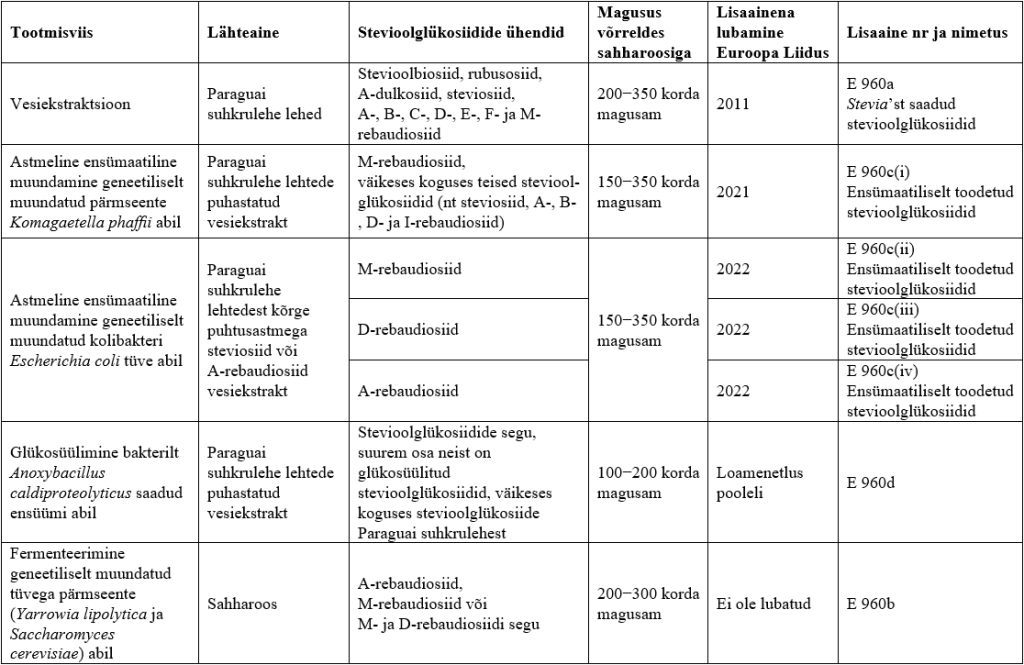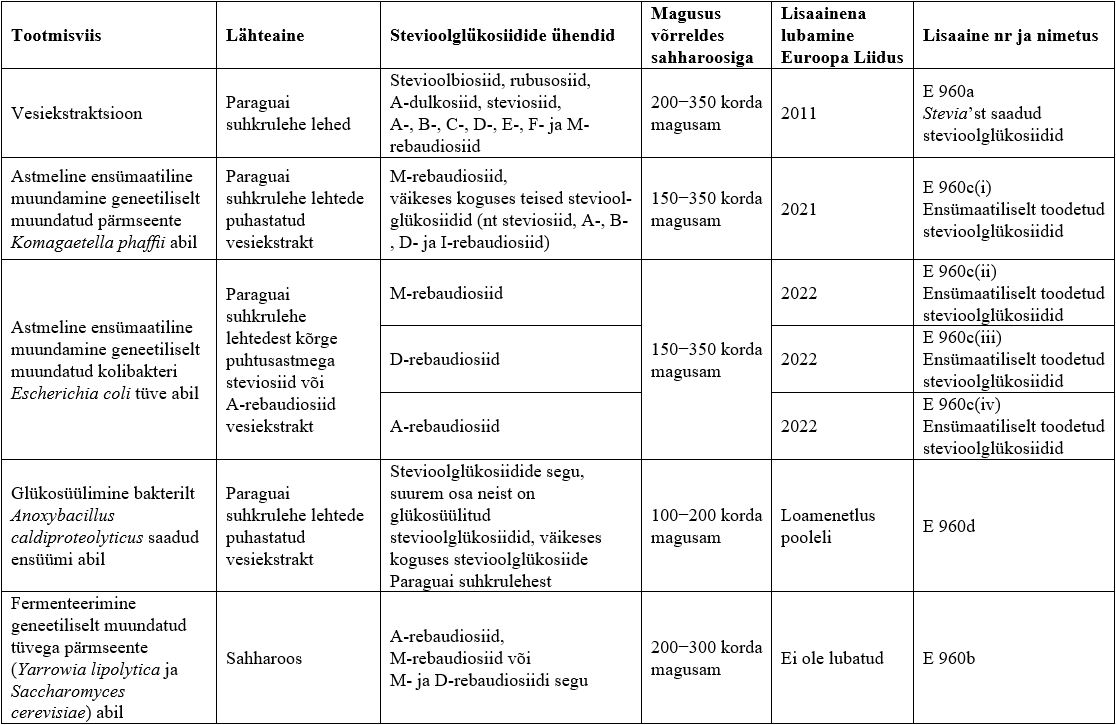 Kuigi stevioolglükosiidide tootmiseks kasutatakse erinevaid meetodeid, on Euroopa Liidus praegu lubatud toidus kasutada kahe eelpool mainitud meetodiga saadud stevioolglükosiide – veega ekstraheeritud ja ensümaatiliselt toodetud. Lubatud tootmismeetodil toodetud stevioolglükosiide on aga veelgi lisandumas. Näiteks andis 2021. aasta detsembris EFSA positiivse hinnangu Paraguai suhkrulehe lehtede puhastatud vesiekstraktist glükosüülimise teel toodetud stevioolglükosiididele (protsess toimub mittegeneetiliselt muundatud, mittetoksilise ja mittepatogeense tüvega bakterilt Anoxybacillus caldiproteolyticus saadud ensüümi kaasabil). Glükosüülitud stevioolglükosiidide liidu lisaainete loetellu lisamise protsess on aga veel pooleli, mille tõttu ei ole ka nende kasutamine magusainena praegu veel lubatud. Glükosüülimise teel saadud stevioolglükosiide looduslikult Paraguai suhkrulehe lehtedes ei leidu.