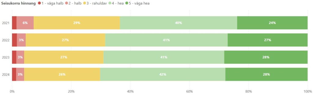 [2] Hoonete seisukorra indeks – omavalitsused hindavad kohalike avalike teenuste põhifunktsiooniga seotud hoonete seisukorda viiepalliskaalal järgmiselt: 1 – väga halb (avariiline seisund, kasutamiseks ohtlik), 2 – halb (vajab kiiremas korras tähelepanu; ei vasta tervisekaitse ja/või tuleohutuse nõuetele; avariioht; kõrgendatud risk), 3 – rahuldav (kasutuskõlblik, kuigi funktsionaalselt vananenud; vajab pidevat järelevalvet avariiohu ennetamiseks), 4 – hea (nõuetekohaselt hooldatud; eakohaselt kulunud; vastab suures osas tervisekaitse ja tuleohutuse nõuetele), 5 – väga hea (kaasajastatud, vastab tervisekaitse ja tuleohutuse nõuetele). Indeks näitab keskmist kaalutud tulemust hoone pinna järgi).