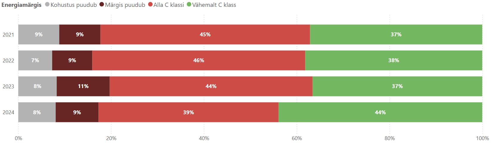 2024. aasta lõpuks oli vähemalt C-klassi energiamärgisega hoonete pinna maht kasvanud 7 protsendipunkti võrreldes 2021. aastaga. Siiski on veel 39% hoonetest alla C-klassi, 9%-l puudub üldse energiamärgis ning 8%-l ei ole energiamärgis kohustuslik (vt joonist 3).
