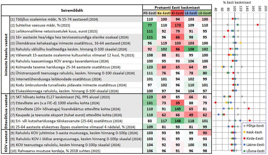 Väljaspool suuremaid kasvukeskusi ei ole piirkonnad suutnud sammu pidada ja nendevahelised lõhed pole vähenenud. Kõige nähtavam on mahajäämus sotsiaalmajanduslikus arengus idapiiriäärsetes maakondades, kus lõhe pealinnaregiooniga püsib suur ja pigem lausa süveneb. Olukorra on nende piirkondade jaoks muutnud veelgi haavatavamaks Venemaa Ukraina-vastase agressioonisõja tõttu katkenud piiriülesed majandussuhted. Nii paistavad Ida-Virumaa ja Kagu-Eesti silma eeskätt madalama sissetuleku, suurema tööpuuduse ja väiksema ettevõtlusaktiivsusega. Samuti on langenud neis piirkondades rahulolu kohalike teenuste kvaliteediga ja elukeskkonnaga. Mitme seirenäitaja taustal paistab suuremate arenguväljakutsetega piirkonnana välja Lääne-Eesti, eriti Hiiumaa, Saaremaa ja Läänemaa.