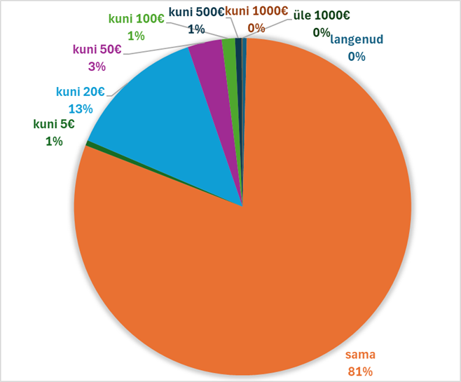 Kuigi linn kehtestas maamaksu aastase kasvu piirmääraks 100%, ei tähenda see automaatselt kahekordset maamaksu kasvu kõikidele maaomanikele. Vastupidi – neljal maaomanikul viiest maamaks ei tõuse (joonis 2) ning see on madalam näitaja kui Eestis keskmiselt. Vaid umbes viiel protsendil maaomanikest (eraisikud ja juriidilised isikud kokku) kasvab maamaks Kohtla-Järve linnas 2026. aastal enam kui 20 euro võrra.